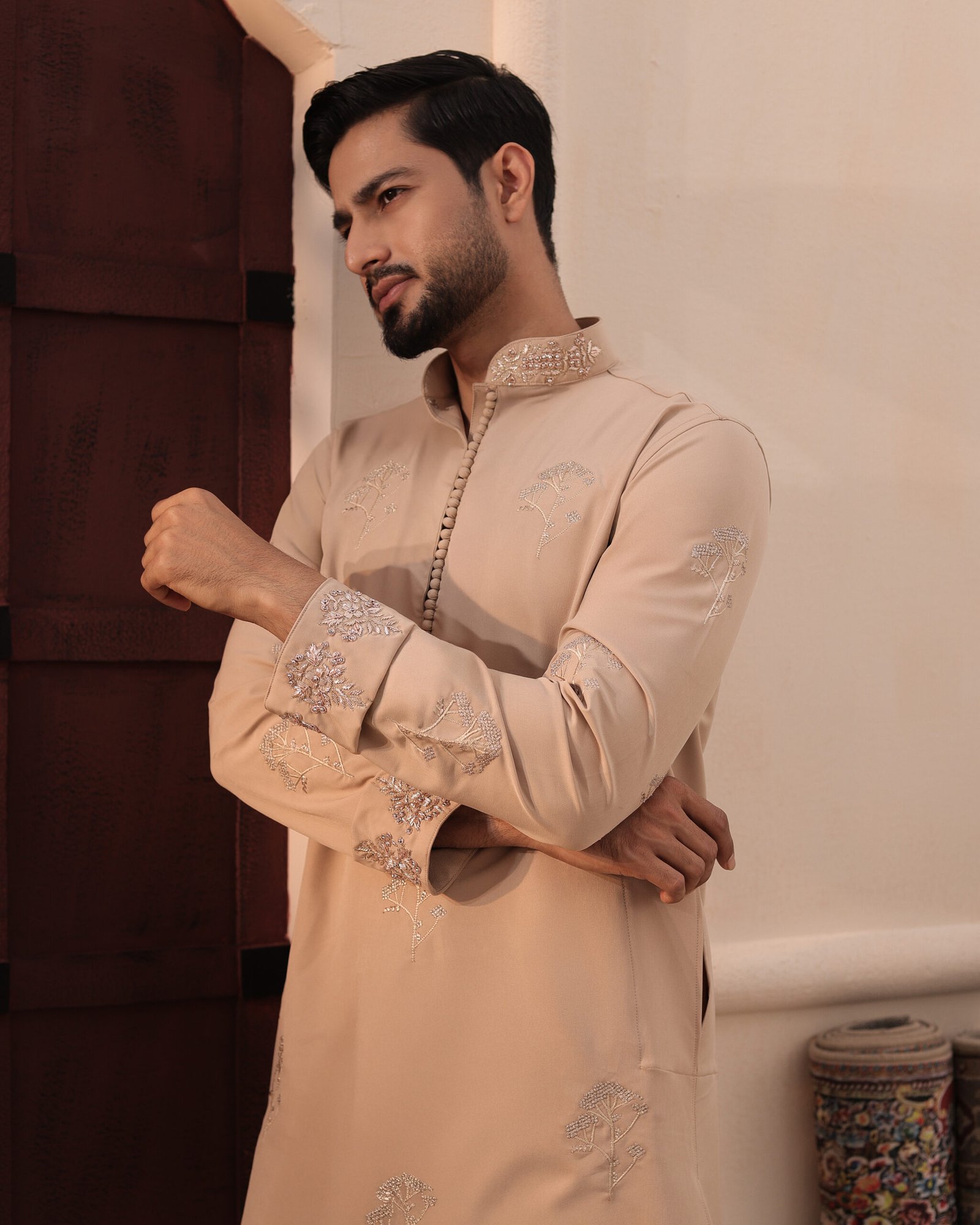Intricate Zardosi embroidery, hand-finished with precision, meets structured silhouettes in deep ceremonial tones. Each thread carries heritage. Each detail reflects distinction.