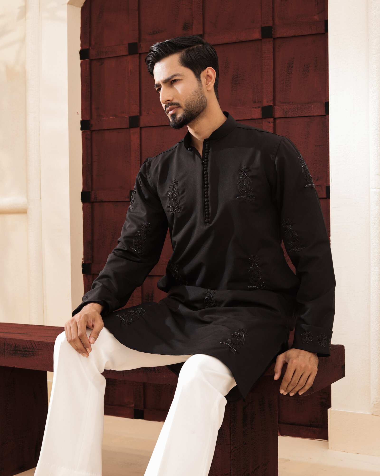 Intricate Zardosi embroidery, hand-finished with precision, meets structured silhouettes in deep ceremonial tones. Each thread carries heritage. Each detail reflects distinction.