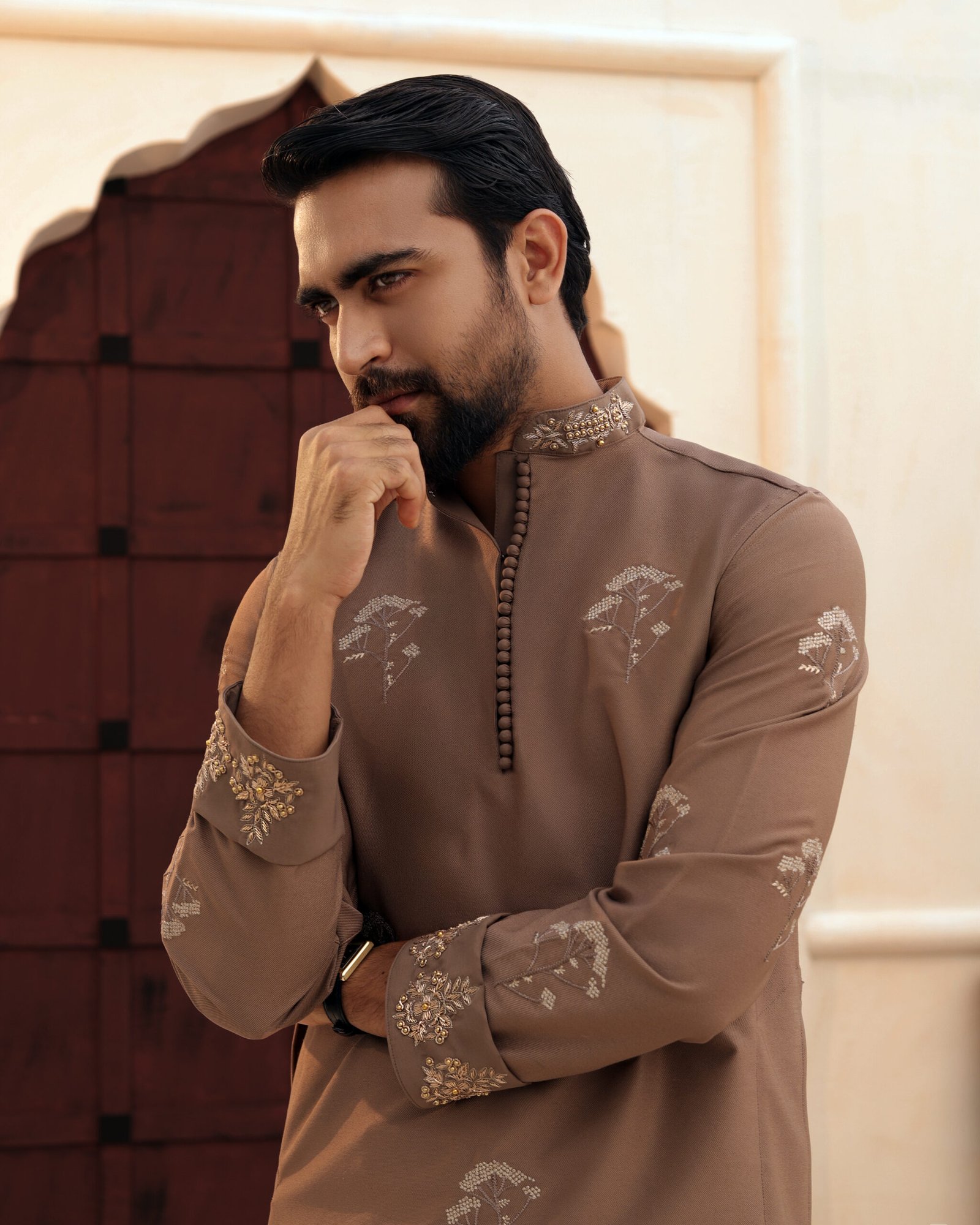 Intricate Zardosi embroidery, hand-finished with precision, meets structured silhouettes in deep ceremonial tones. Each thread carries heritage. Each detail reflects distinction.