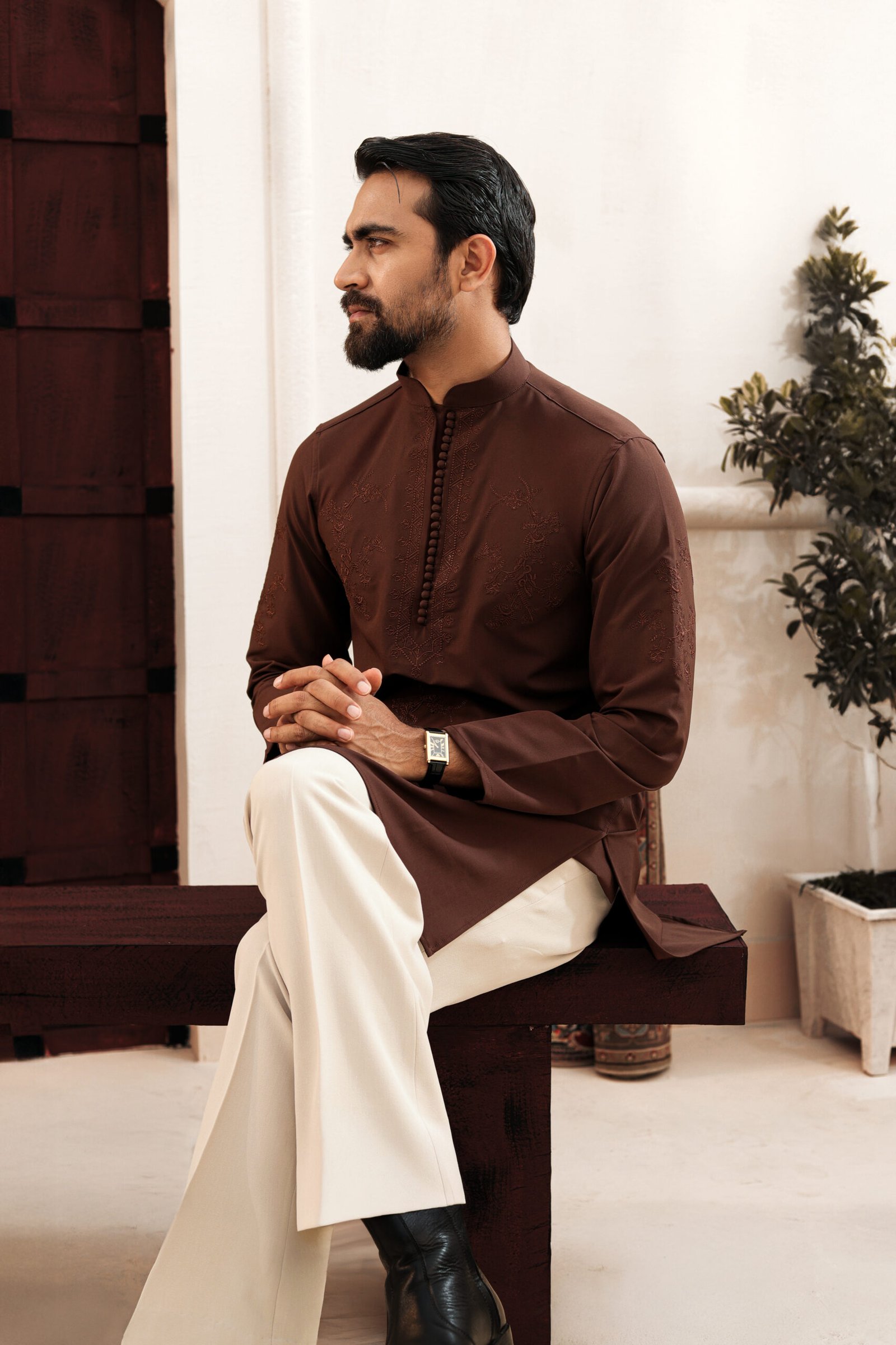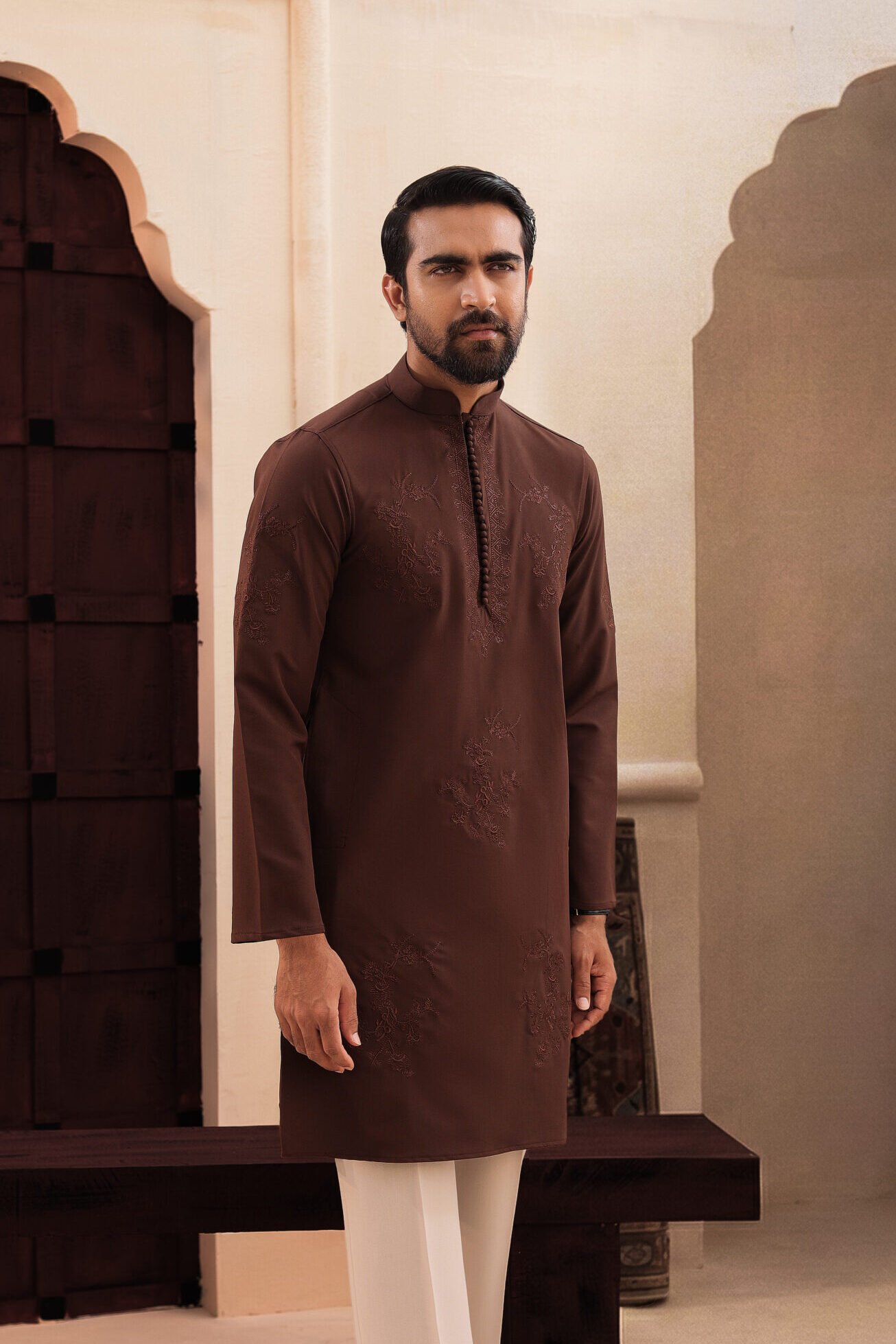 Crafted in a refined sable hue with intricate embroidery. A silhouette defined by structure, restraint, and heritage craftsmanship.