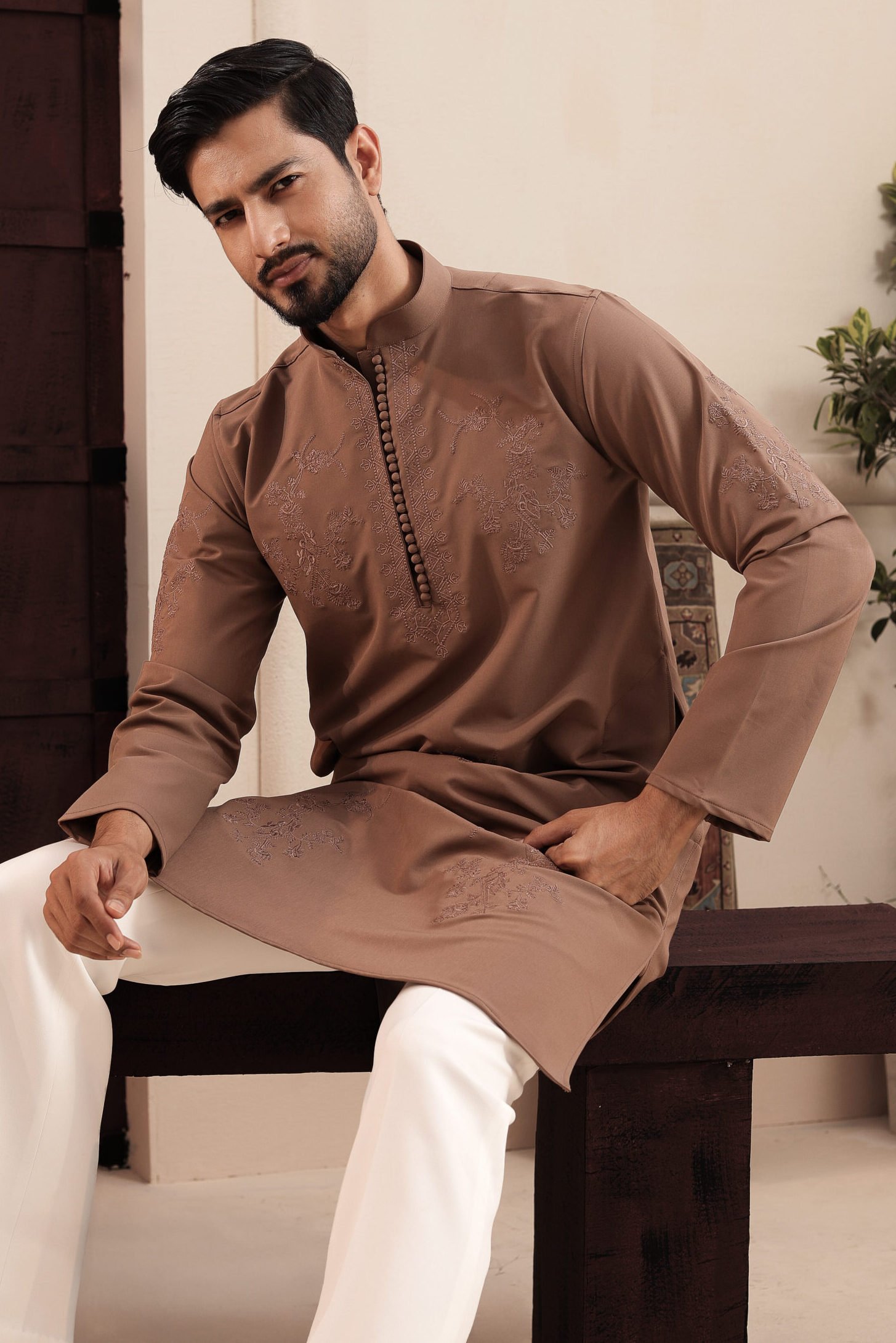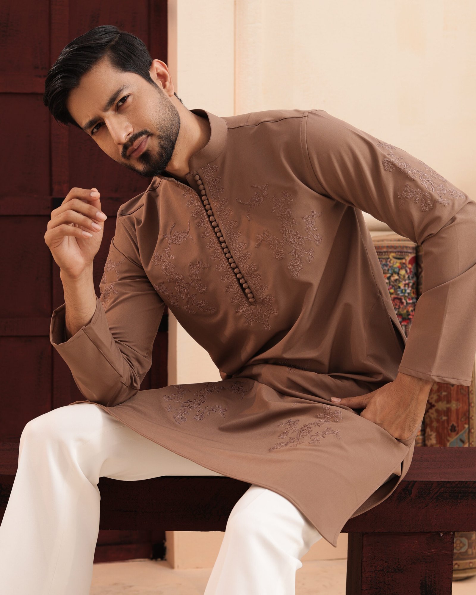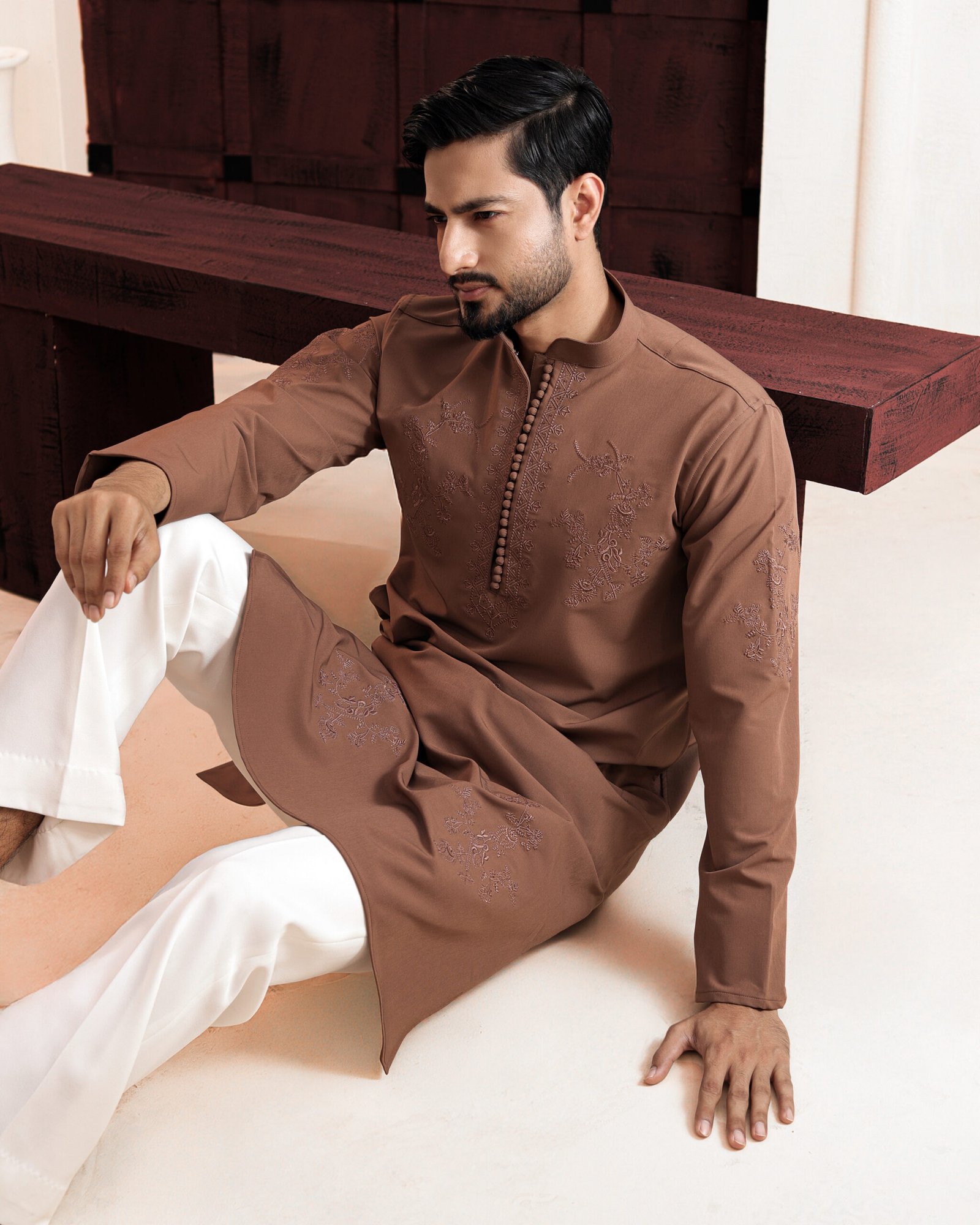 Crafted in a refined sable hue with intricate embroidery. A silhouette defined by structure, restraint, and heritage craftsmanship.